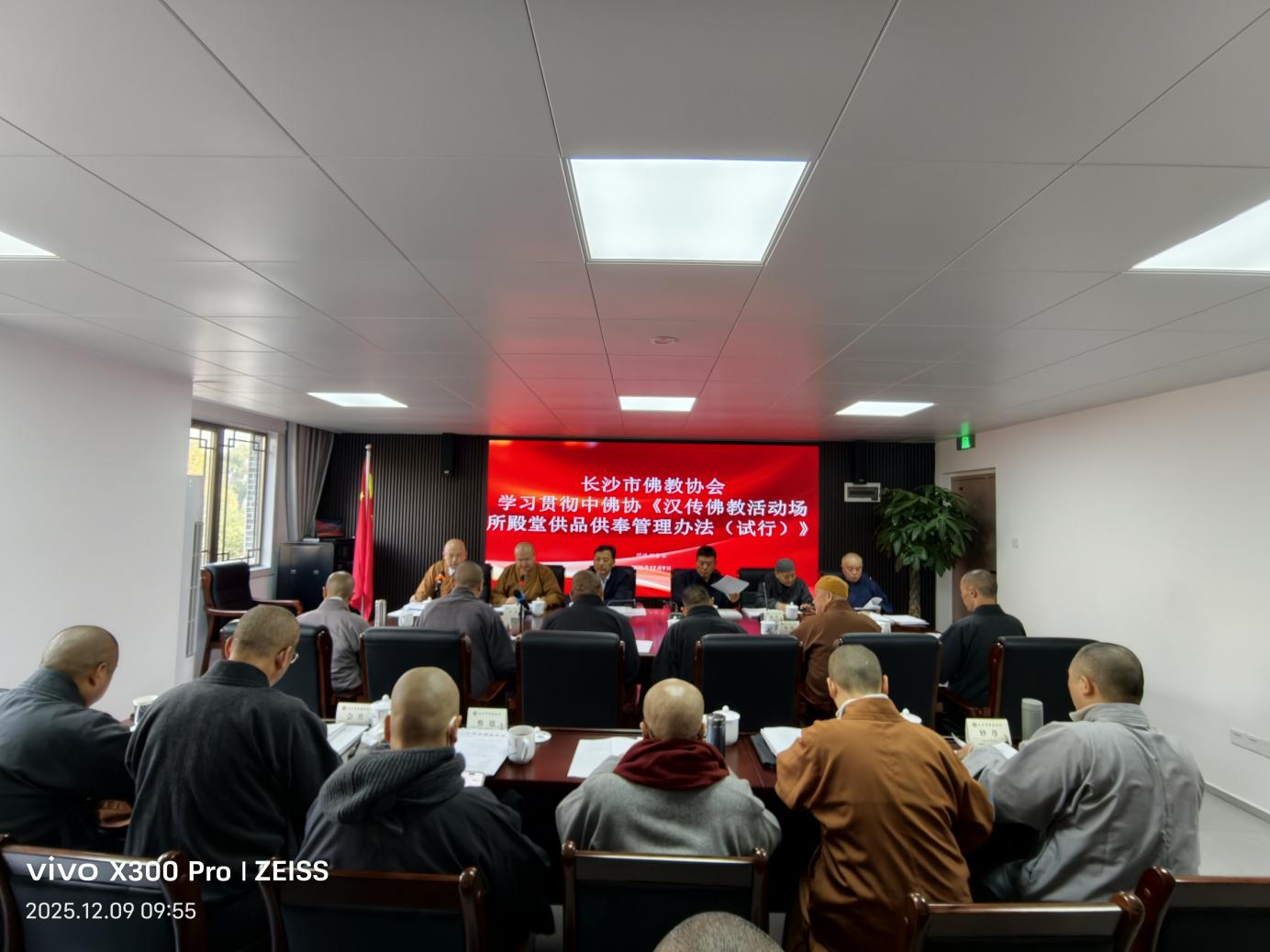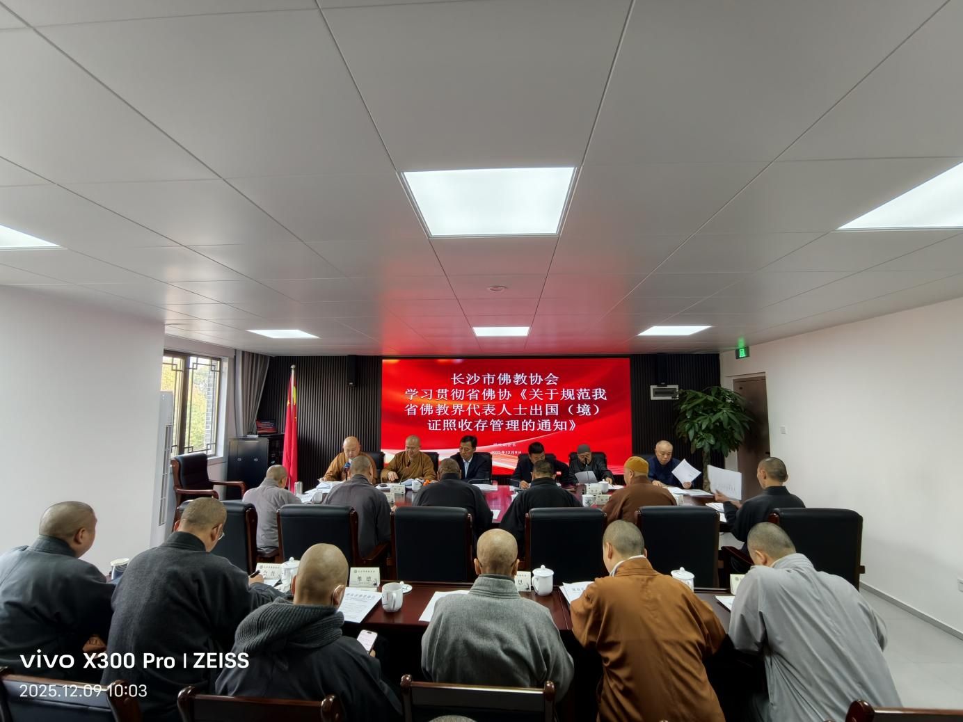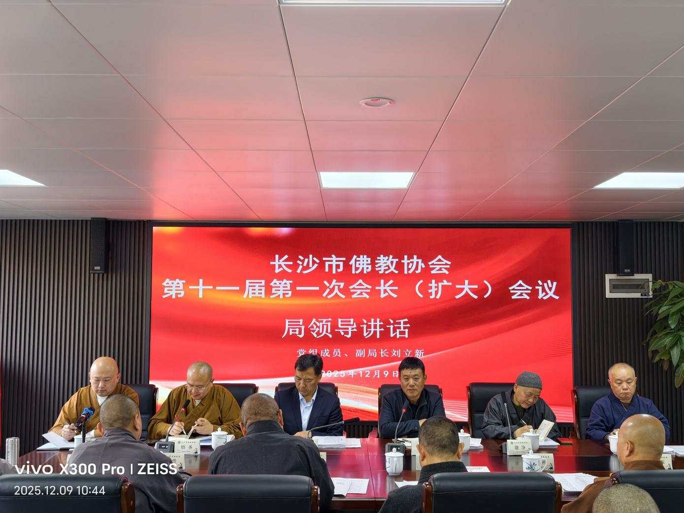 2025年12月9日,市佛协第十一届第一次会长(扩大)会议在市佛协新办公楼召开。长沙市民宗局党组书记、局长杨光华,长沙市民宗局党组成员、副局长刘立新莅会指导。市佛协副秘书长以上人员及相关人员参加会议,会长悟圣法师主持会议。