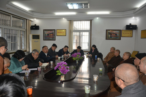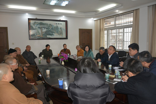 2月9日,省委统战部民宗处处长孙卫民、民宗处副调研员王志刚及省民宗委人事处副处长张占军、宗教一处副处长唐志兵一行,在市民宗局副局长穆豫湘、市委统战部等领导陪同下,就即将召开的中佛协代表会议中的出席代表推选等事宜,以集体座谈、个别谈话等形式开展调研工作,征求和听取市佛协意见。市佛协班子成员坚愿、法通、能净、自然、增慧、照观及有关人员出席座谈会。