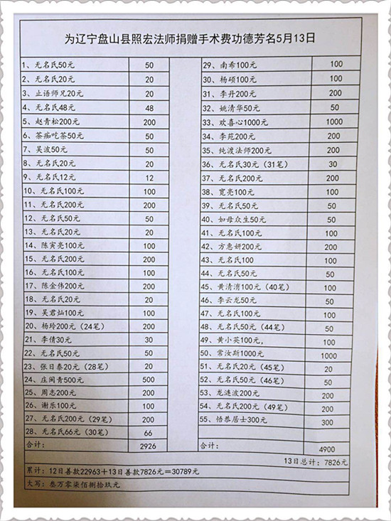 昨天5月12日下午13:30,为了帮助辽宁省盘山县照宏法师(俗名王月树)解决手术费,自然法师在朋友圈发起了一篇名为“为重病僧人募捐缘起”的爱心帖,法师饱含深情地说:出家人斩断爱索情缘,以"不忍众生苦、不忍圣教衰"之悲愿,绍继圣种,传承善法。号召本寺护法居士、共修营员及一切有缘朋友,参与救护僧宝活动。帖子发布不到3分钟,大众纷纷共襄义举,通过法师公布的二维码捐善款、献爱心。长沙县的周居士率全家人一次捐款五千元,成成居士不仅自己奉献爱心,还将法师的帖子转到自己的朋友圈,动员大家参与善行。爱,在无声传递……。自帖子发布开始到13日上午10时为止,在不到21个小时的时间里,累计募得善款30789元,193位爱心人士在特别的日子里用自己的善行共同谱写了一篇爱的华章!并获知照宏法师已经与医院商定,下周二动手术。特别的因缘特别的爱,以此功德回向法界有情离苦得乐、自在轻安。