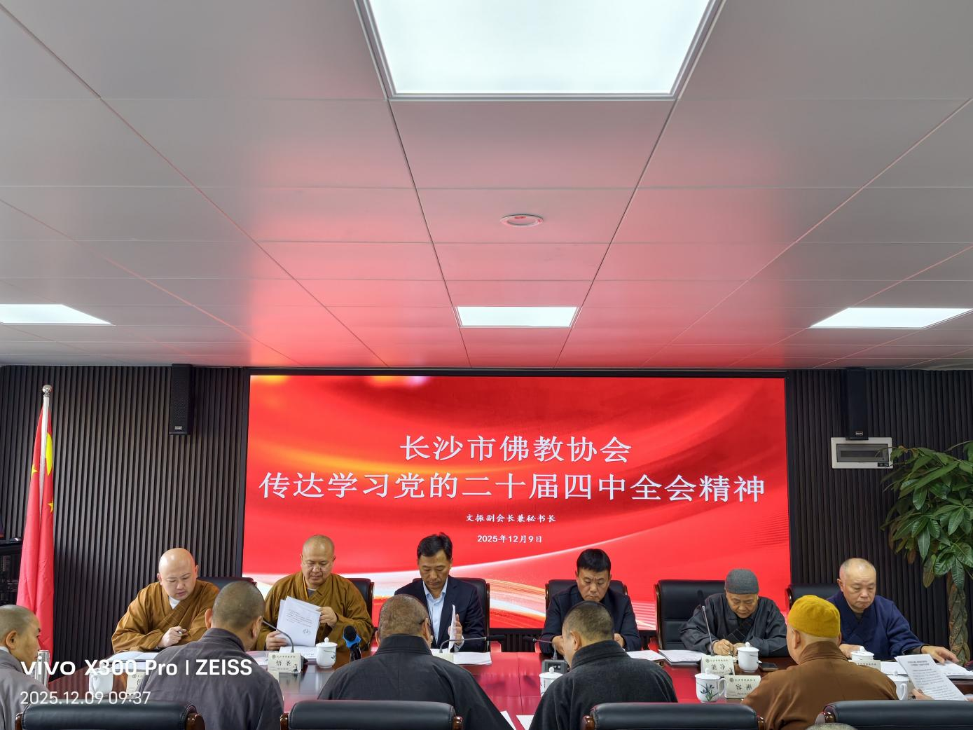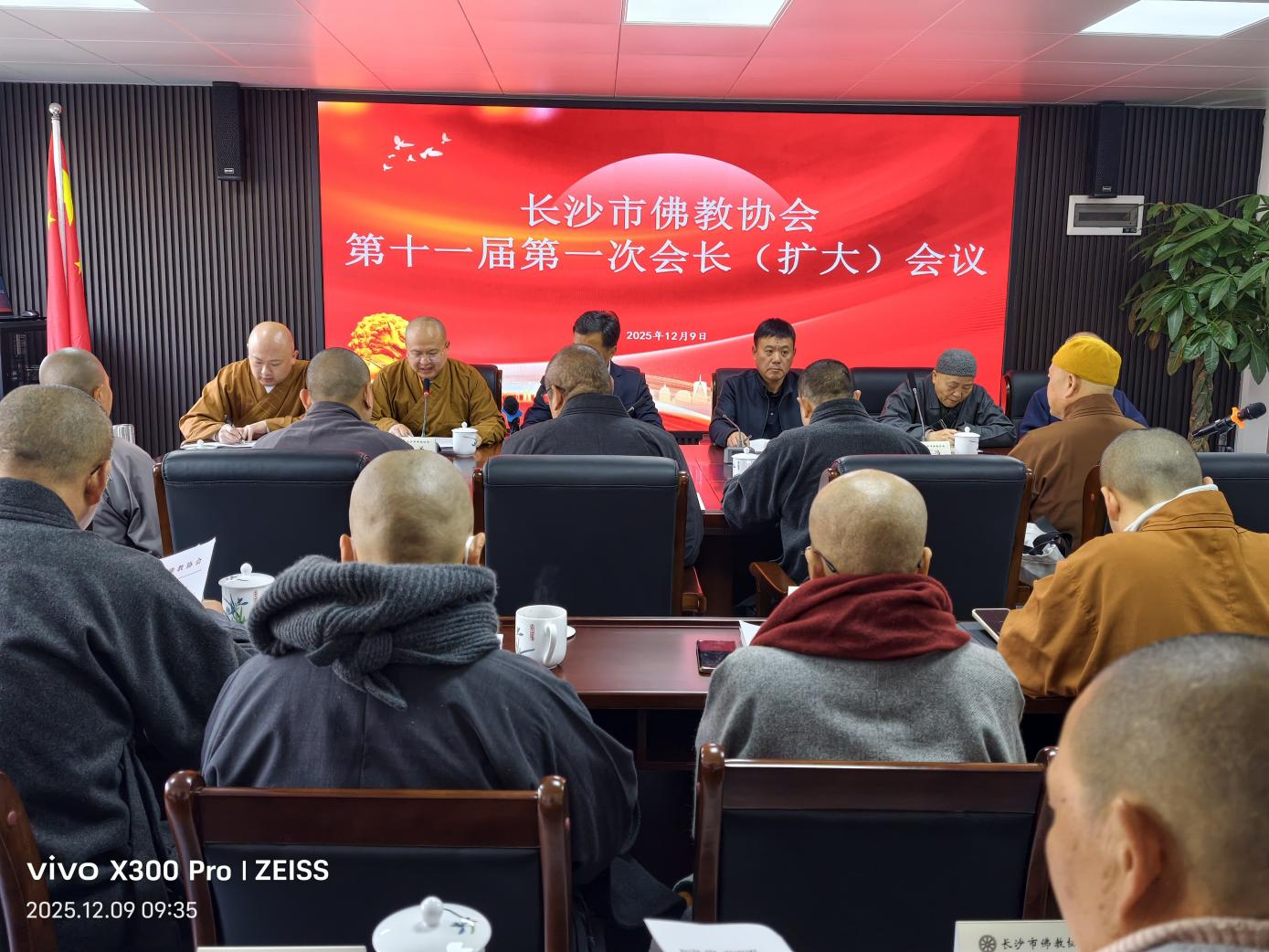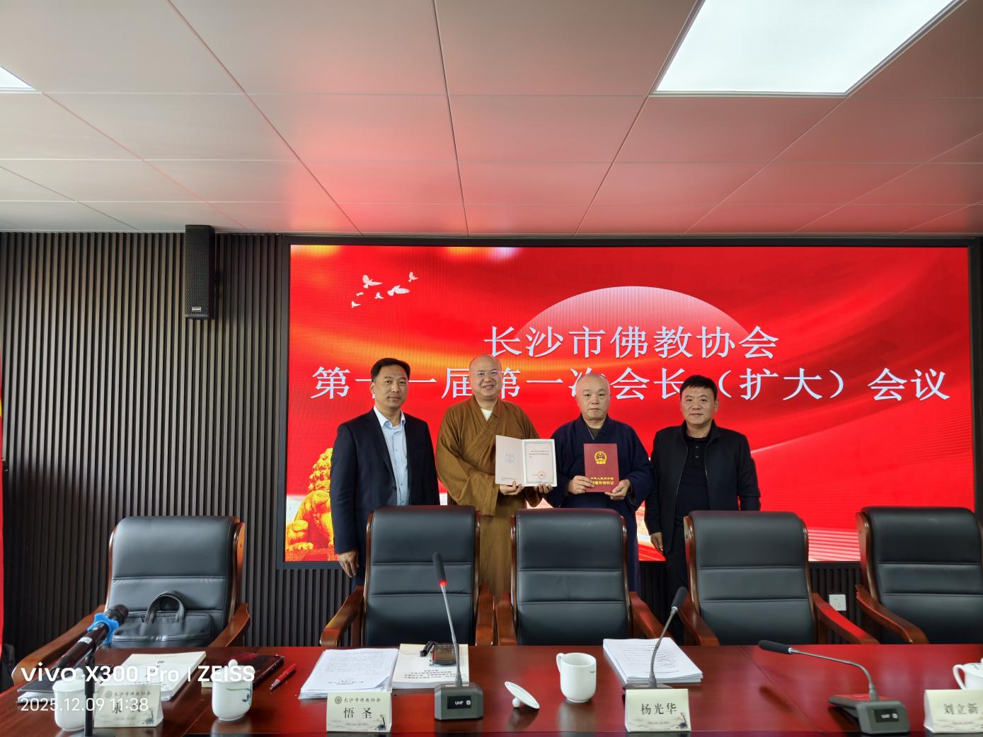 2025年12月9日,市佛协第十一届第一次会长(扩大)会议在市佛协新办公楼召开。长沙市民宗局党组书记、局长杨光华,长沙市民宗局党组成员、副局长刘立新莅会指导。市佛协副秘书长以上人员及相关人员参加会议,会长悟圣法师主持会议。