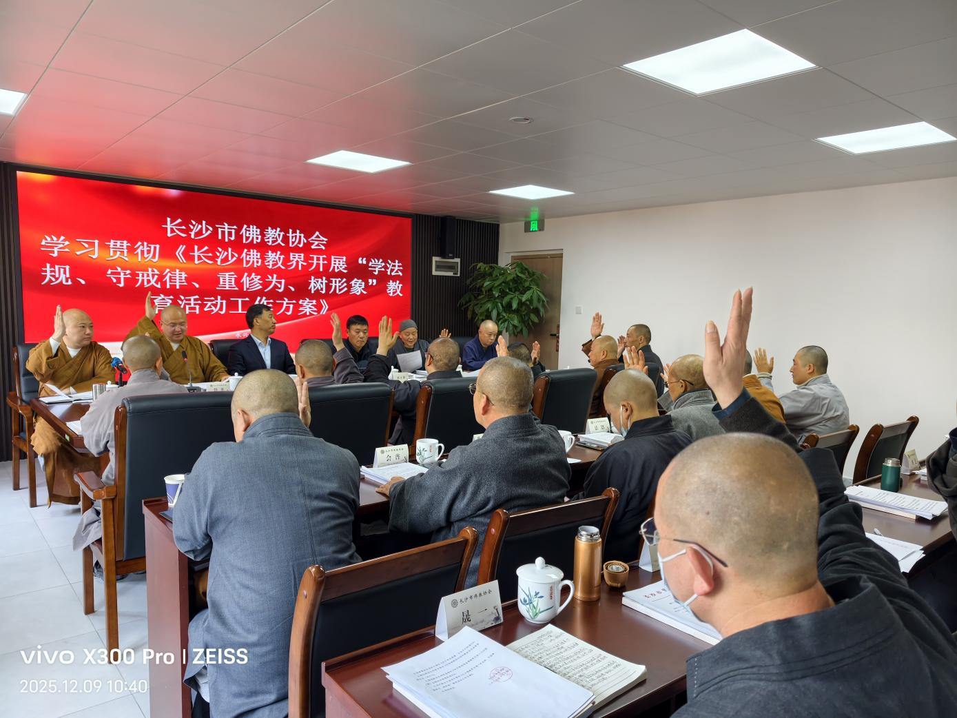 会议传达学习了党的二十届四中全会精神,集中学习了中佛协《关于崇俭戒奢、正信正行的倡议》、《汉传佛教活动场所殿堂供品供奉管理办法(试行)》,省佛协《关于规范我省佛教界代表人士出国(境)证照收存管理的通知》,市佛协《长沙佛教界开展“学法规、守戒律、重修为、树形象”教育活动工作方案》,审议通过《市佛协内设机构、职责及人员分工》等文件。会议通报并接受了监事长增慧法师向市佛协无偿捐赠房产的事项。